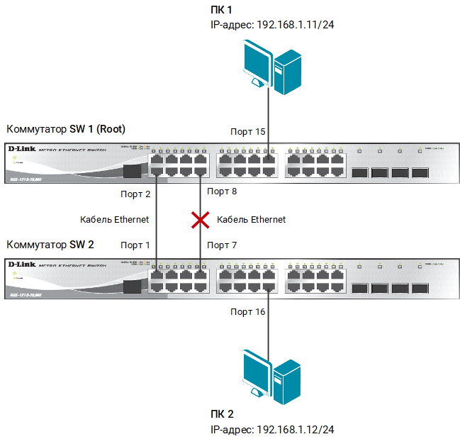 Не соединяйте коммутаторы одновременно двумя кабелями во время настройки. Это может привести к широковещательному шторму.