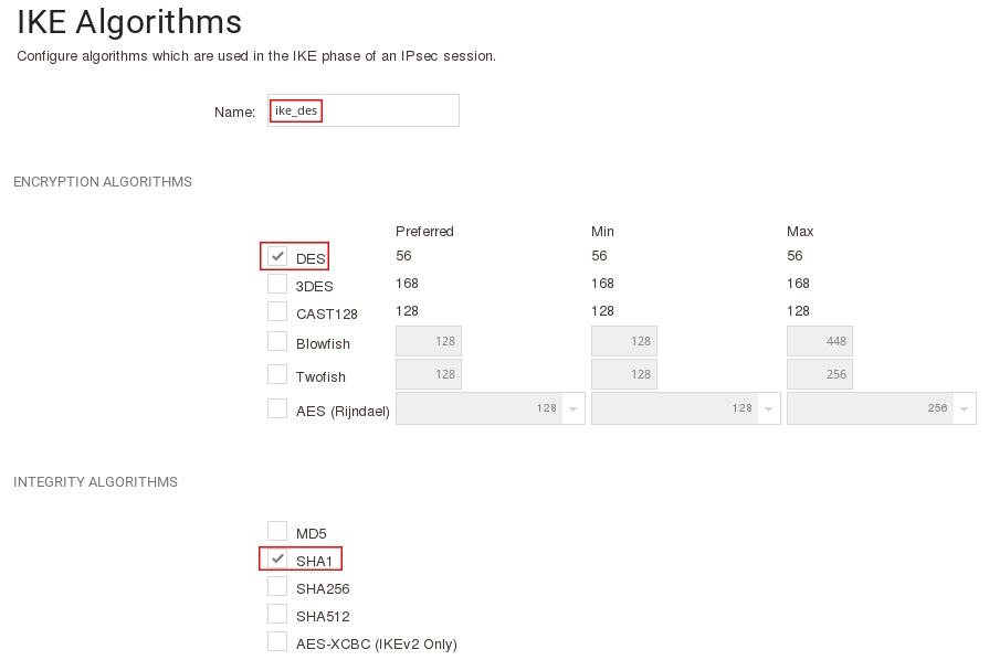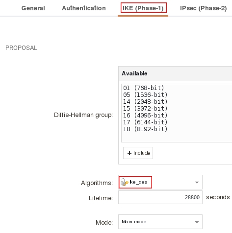 Пройдите на вкладку IKE (Phase-1) и в поле Algorithms укажите ike_des