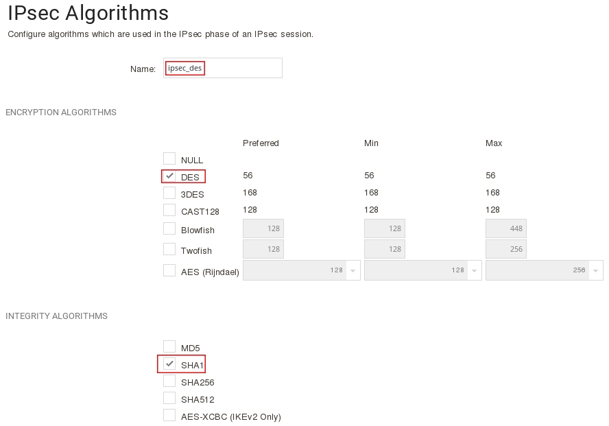 add IPsecAlgorithms ipsec_des DESEnabled=Yes SHA1Enabled=yes