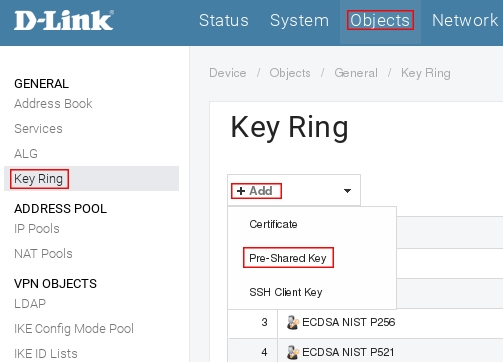 Пройдите в Web интерфейсе Objects → Key Ring, нажмите кнопку Add и выберите Pre-Shared Key