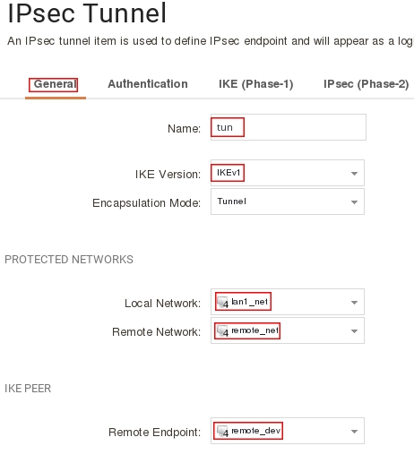 add Interface IPsecTunnel tun PSK=tunkey LocalNetwork=InterfaceAddresses/lan1_net RemoteNetwork=remote_net RemoteEndpoint=remote_dev IKEAlgorithms=ike_des IPsecAlgorithms=ipsec_des