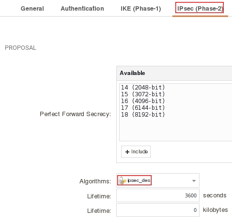 Пройдите на вкладку IPsec (Phase-2) и в поле Algorithms укажите IPsec_des