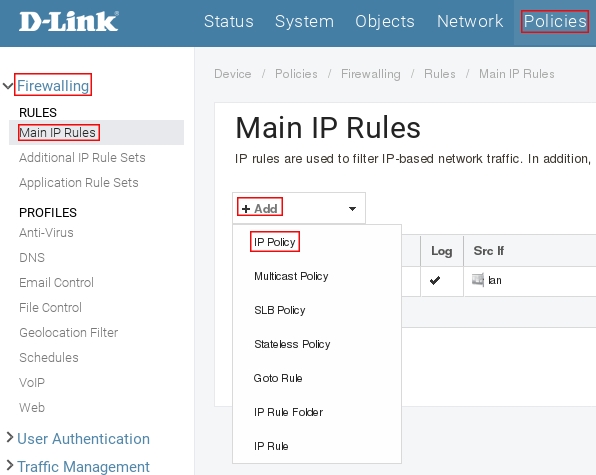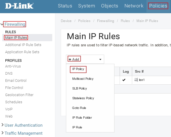 Пройдите в Web интерфейсе Policies → Firewalling → Main IP Rules, нажмите кнопку Add и выберите IP Policy.