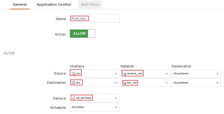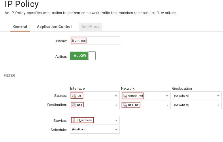 add IPPolicy Name=from_tun SourceInterface=tun SourceNetwork=remote_net DestinationInterface=lan1 DestinationNetwork=InterfaceAddresses/lan1_net Service=all_services Action=Allow