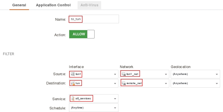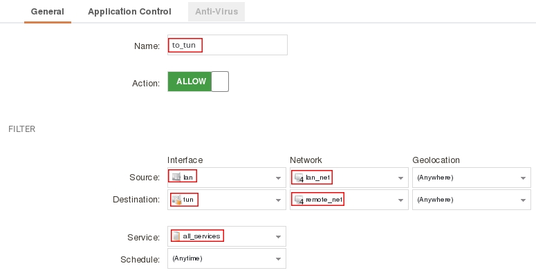 add IPPolicy Name=to_tun SourceInterface=lan SourceNetwork=InterfaceAddresses/lan_net DestinationInterface=tun DestinationNetwork=remote_net Service=all_services Action=Allow