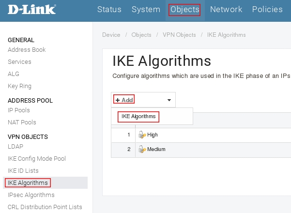 Пройдите в Web интерфейсе Objects → IKE Algorithms, нажмите кнопку Add и выберите IKE Algorithms
