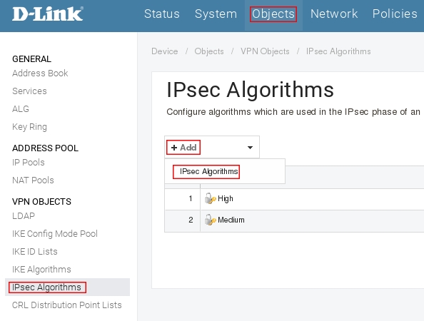 Пройдите в Web интерфейсе Objects → IPsec Algorithms, нажмите кнопку Add и выберите IPsec Algorithms.