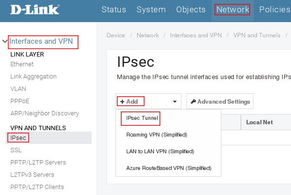 Пройдите в Web интерфейсе Network → Interfaces and VPN → IPsec нажмите кнопку Add и выберите Ipsec Tunnel.