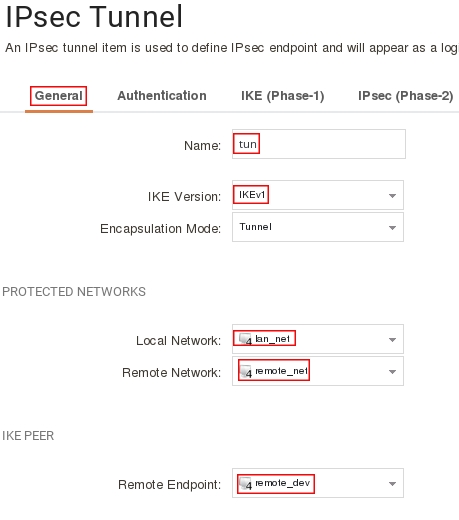 add Interface IPsecTunnel tun PSK=tunkey LocalNetwork=InterfaceAddresses/lan_net RemoteNetwork=remote_net RemoteEndpoint=remote_dev IKEAlgorithms=ike_des IPsecAlgorithms=ipsec_des