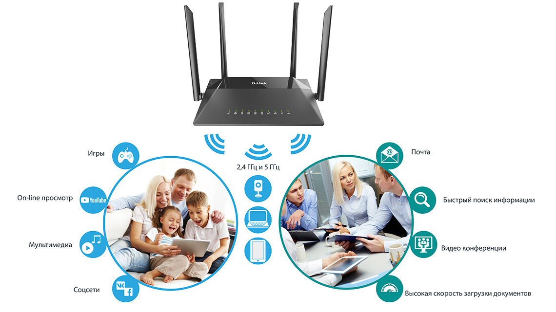 Используя беспроводной маршрутизатор DIR-825, Вы сможете быстро организовать высокоскоростную беспроводную сеть дома и в офисе, предоставив доступ к сети Интернет компьютерам и мобильным устройствам практически в любой точке (в зоне действия беспроводной сети). Одновременная работа в диапазонах 2,4 ГГц и 5 ГГц позволяет использовать беспроводную сеть для широкого круга задач. Маршрутизатор может выполнять функции базовой станции для подключения к беспроводной сети устройств, работающих по стандартам 802.11a, 802.11b, 802.11g, 802.11n и 802.11ac (со скоростью беспроводного соединения до 1167 Мбит/с)3.
