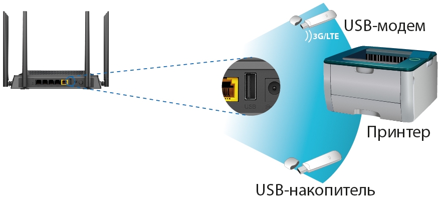 Маршрутизатор оснащен USB-портом для подключения USB-модема, при помощи которого Вы сможете оперативно подключаться к сети Интернет. Кроме того, Вы можете подключить к USB-порту маршрутизатора USB-накопитель, который будет использоваться в качестве сетевого диска, или принтер1.