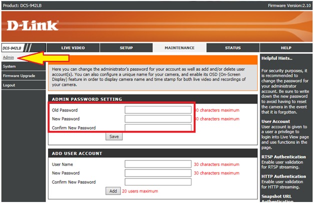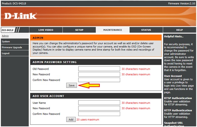Сұрақ: Как задать пароль администратора на камере DCS-942L?