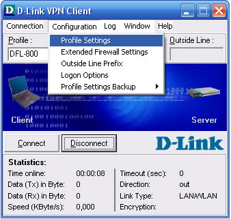 Шаг 2: Выберите DFL-800 в настройках профиля (profile settings) и кликните по Configure. Если профиль не существует, кликните по New Entry для создания нового профиля.