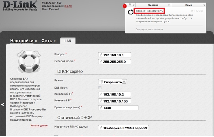 После перезагрузки необходимо обращаться к Wеб-интерфейсу по новому адресу (в данном примере 192.168.10.1). Убедитесь, что на сетевой карте компьютера установлены верные параметры.