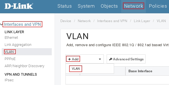 На устройствах DFL, VLAN это всегда L3 интерфейс, т.е. При его настройки всегда необходимо задать IP адрес и подсеть. В зависимости от модели DFL VLAN можно настроить поверх любого интерфейса, весь трафик в этом случае буде тегированным. Если создать VLAN на интерфейсе LAN таких устройств как DFL-260E/860E, то в тегированном виде этот VLAN будет доступен на любом из портов LAN.
