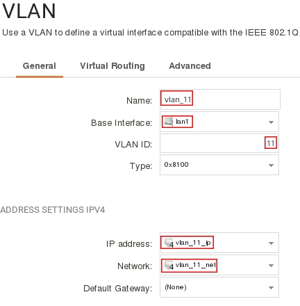 add Interface VLAN vlan_11 BaseInterface=lan1 IP=vlan_11_ip Network=vlan_11_net VLANID=11