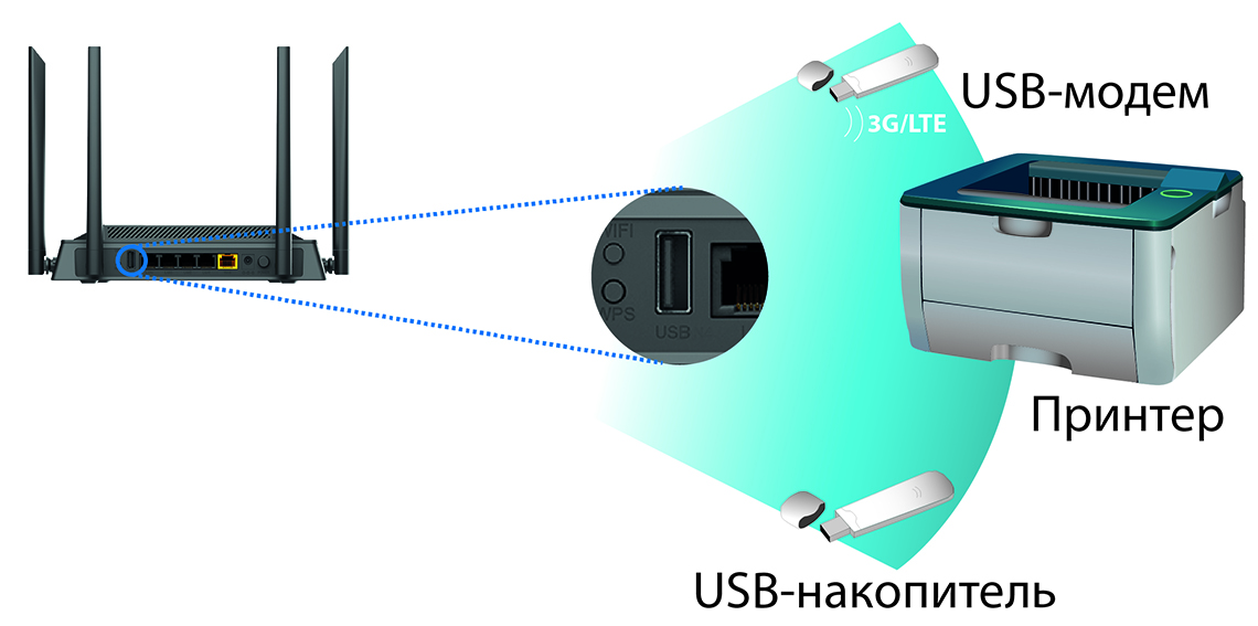Маршрутизатор оснащен USB-портом для подключения USB-модема, при помощи которого Вы сможете оперативно подключаться к сети Интернет. Кроме того, Вы можете подключить к USB-порту маршрутизатора USB-накопитель, который будет использоваться в качестве сетевого диска, или принтер.