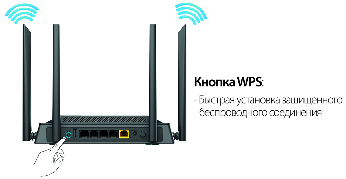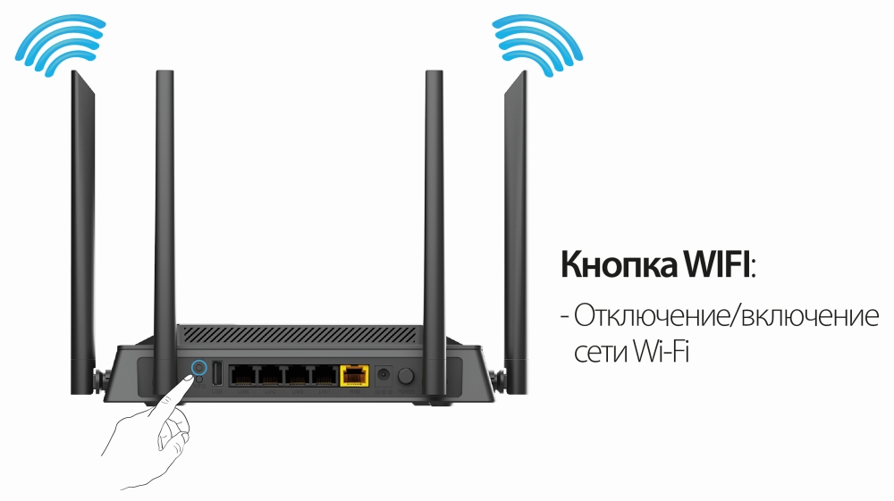 Кроме того, устройство оборудовано кнопкой для выключения/включения Wi-Fi-сети. В случае необходимости, например, уезжая из дома, Вы можете выключить беспроводную сеть маршрутизатора одним нажатием на кнопку, при этом устройства, подключенные к LAN-портам маршрутизатора, останутся в сети.