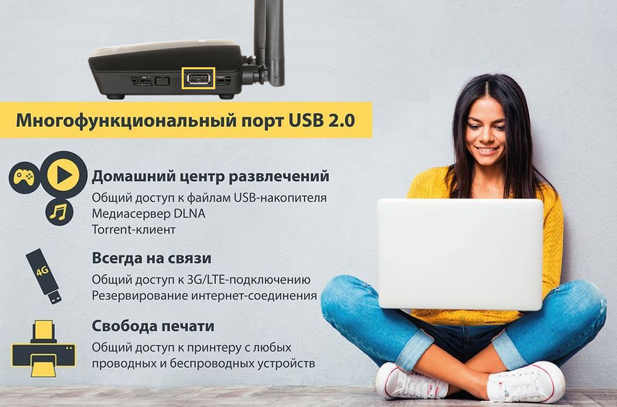 Маршрутизатор оснащен USB-портом для подключения USB-модема, при помощи которого Вы сможете оперативно подключаться к сети Интернет. Кроме того, Вы можете подключить к USB-порту маршрутизатора USB-накопитель, который будет использоваться в качестве сетевого диска, или принтер.