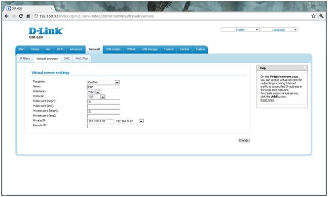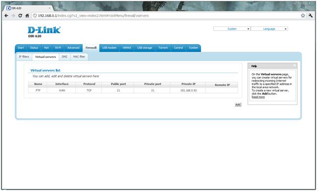 Arba pasirinkite Firewall >> Virtuall servers ir spauskite Add.