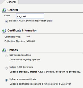 2. Nurodykite sertifikato pavadinimą Name: ca-cert, uždėkite varnelę ant Disable CRLs. Skiltyje Options pažymėkite paskutinį laukelį Upload a remote certificate.