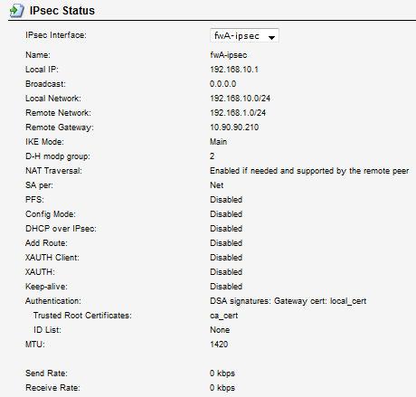 8. Lygiai tokius pačius veiksmus atlikite kitame DFL įrenginyje. Šakninis sertifikatas turi būti bendras (toks pat), o įrenginių sertifikatai turi būti sukurti kiekvienam įrenginiui atskiri. Įsitikinti sertifikatų ir raktų veikimu galima peržiūrėjus veikiančio IPSec tunelio statistiką: pasirinkite Interfaces -> IPsec.