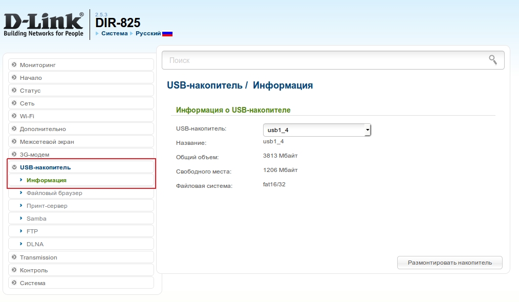 1. В основном меню слева в разделе USB-накопитель выберите пункт Информация, чтобы убедиться, что USB-накопитель, подключенный к USB-порту маршрутизатора, определился в системе.