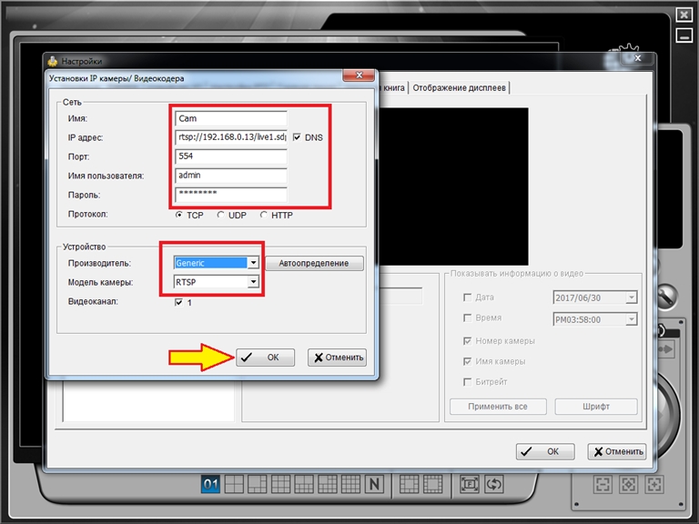 IP-адрес – введите адрес ссылки на RTSP поток;