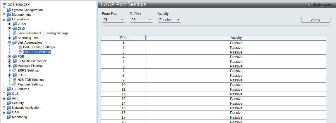Шаг 2. В разделе Link Aggregation → LACP Port Settings. Задайте диапазон портов 1–8, выбрав соответствующие значения в полях From Port и To Port. В поле Activity должен быть выбран режим Passive. Нажмите Apply.