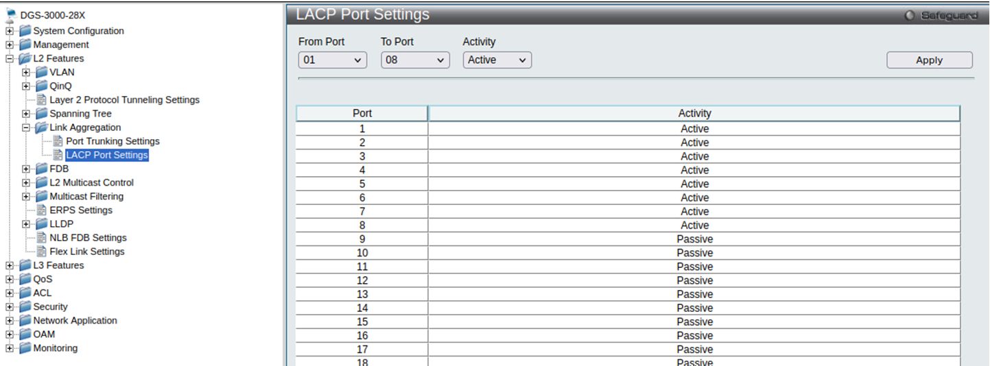 Перейдите в пункт меню Link Aggregation → LACP Port Settings. Выберите в поле Activity режим работы портов Active. Нажмите Apply.