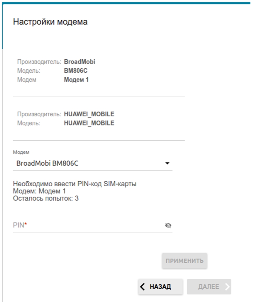 - Если для SIM-карты, установленной во встроенный модем, установлена проверка PIN-кода, введите PIN-код в поле PIN и нажмите кнопку ПРИМЕНИТЬ.