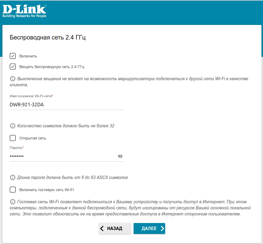 Рисунок 2. Пример настройки на DWR-980 - Выполните настройку беспроводной сети для диапазона 2,4 ГГц. Для этого введите Имя основной Wi-Fi-сети и задайте Пароль.