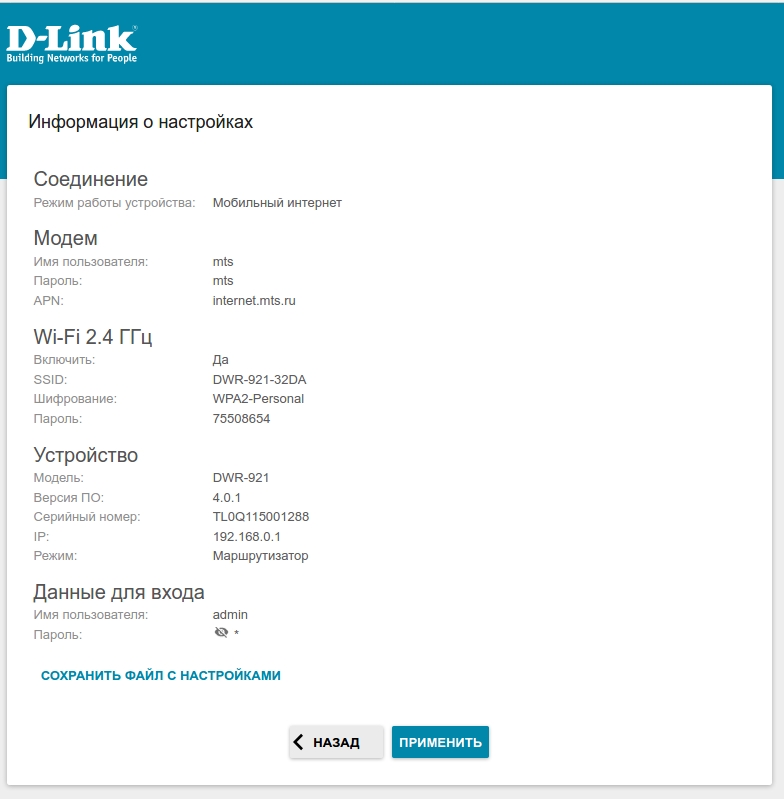- На следующей странице должно появиться окно с информацией о выполненных настройках. Можно сохранить данные настройки в текстовый документ, нажав для этого кнопку Сохранить файл с настройками. Нажмите Применить.
