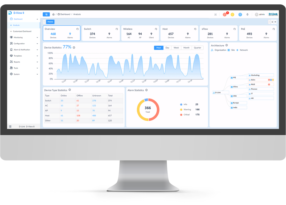 Real-time network analysis provides insight into network operations, where network visibility is extremely important. With D-View 8 you can gain insight on device statistics, critical alarms of managed devices, running status of wired and wireless devices, CPU/memory utilization, wired and wireless throughput of devices.