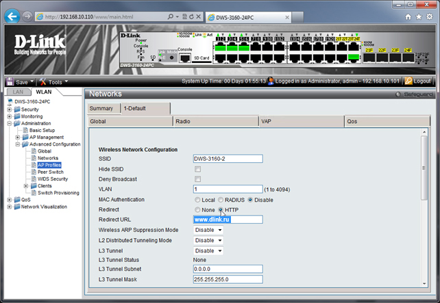 Процедура настройки WEB-редиректа (обязательного перенаправления первого захода клиента на заданный сайт) на комплексном беспроводном решении на основе коммутаторов DWS-3160-24