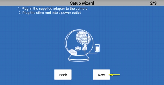 Шаг 6: Если Вы еще не сделали этого, подключите к камере входящий в комплект поставки кабель питания (или USB-аккумулятор). Коснитесь значка Next (Далее).
