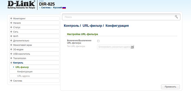 1. В основном меню слева выберите раздел Контроль и перейдите на страницу URL-фильтр / Конфигурация.