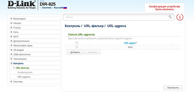 В зависимости от того, какой тип URL-фильтра был выбран на странице Конфигурация, будут блокироваться все адреса, где встречается «dlink» (Тип фильтра: Блокировать указанные адреса), или будут блокироваться все адреса, кроме тех, где встречается «dlink» (Тип фильтра: Блокировать все адреса, кроме указанных).