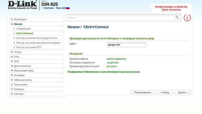 11. На следующей странице будет выполнена проверка доступности заданного узла в сети Интернет (по умолчанию google.com). По результатам проверки можно судить о правильности выполненных настроек соединения.