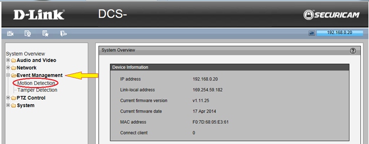 Шаг 5. В меню слева в разделе Event Management (Управление событиями) выберете Motion Detection (Обнаружение движения).