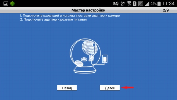 Шаг 6: Если Вы еще не сделали этого, подключите к камере входящий в комплект поставки кабель питания (или USB-аккумулятор). Коснитесь значка Далее.
