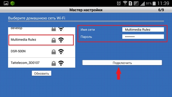 Шаг 10: В представленном списке выберите домашнюю беспроводную сеть, к которой необходимо подключиться, и в соотвествующем поле введите пароль для выбранной беспроводной сети. Имя сети, к которой необходимо подключиться, также можно ввести вручную в поле Имя сети. Далее коснитесь значка Подключить.