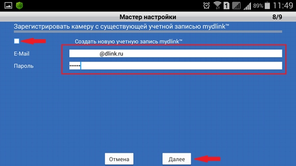 2. Если у Вас нет учетной записи mydlink, установите флажок в поле Создать новую учетную запись mydlink™ и введите адрес электронной почты и пароль для новой учетной записи. Коснитесь Далее.