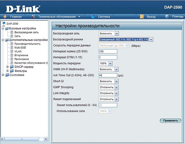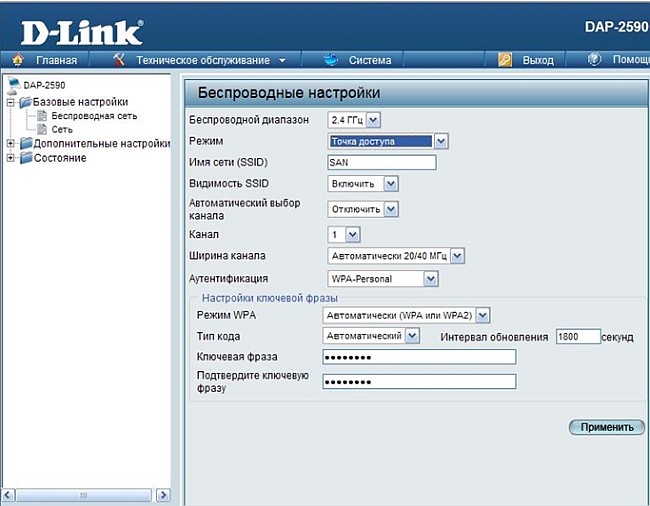 Беспроводной диапазон – выберите диапазон, в котором будет работать точка доступа: 2,4ГГц (стандарты 802.11g и 802.11n) или 5ГГц (802.11a и 802.11n).