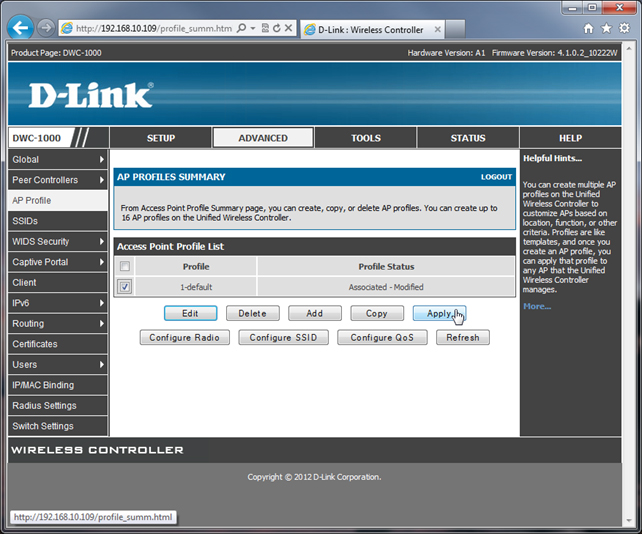В списке Access Point Profile List в столбце информации о состоянии изменённого нами профиля видим его статус «Associated - Modified».