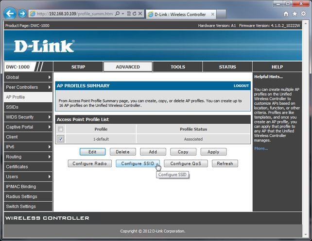 В списке Access Point Profile List выбираем нужный профиль (в нашем примере – default) и нажимаем кнопку «Configure SSID»