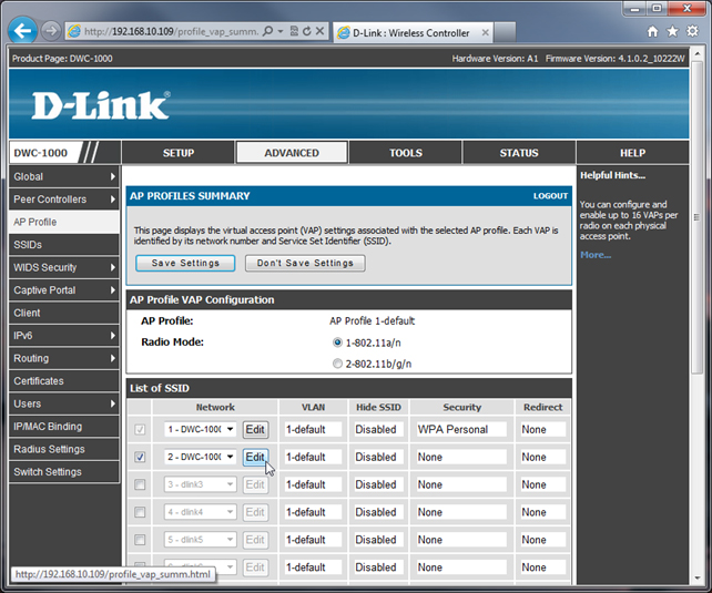 На открывшейся странице в списке имён активных беспроводных сетей (List of SSID) выбираем нужный SSID (в нашем примере – DWC-1000-2) и нажимаем кнопку «Edit».