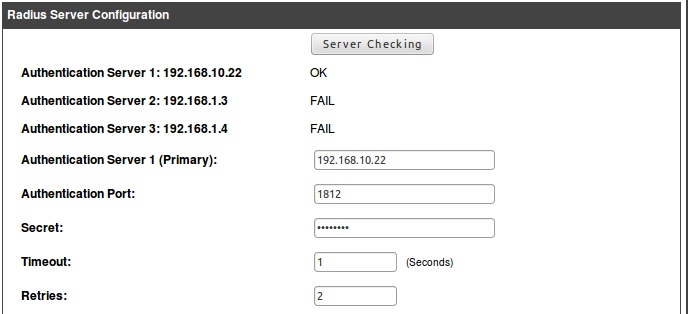 Переходим в меню Setup → External Authentications → Radius Settings → Radius Server Settings.