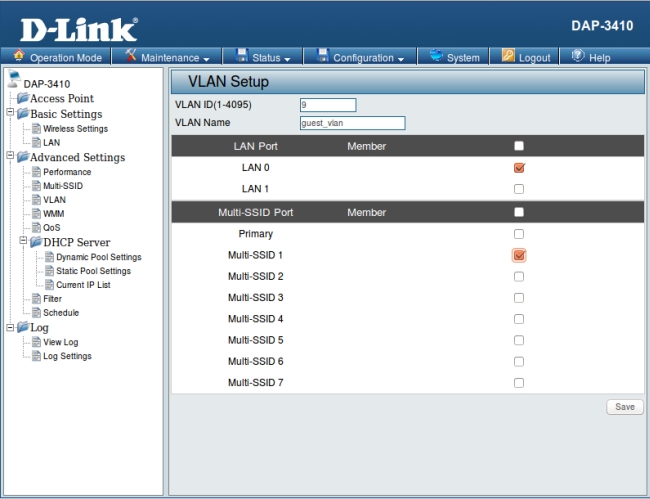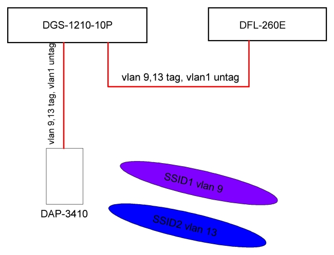 В результате на портах для подключения точки доступа и DFL vlan должны быть настроены следующим образом: vlan 1 — untagged ;  vlan 9, vlan 13 — tagged ; PVID (port vlan id) — 1 (по умолчанию включена функция автоматического назначения PVID).