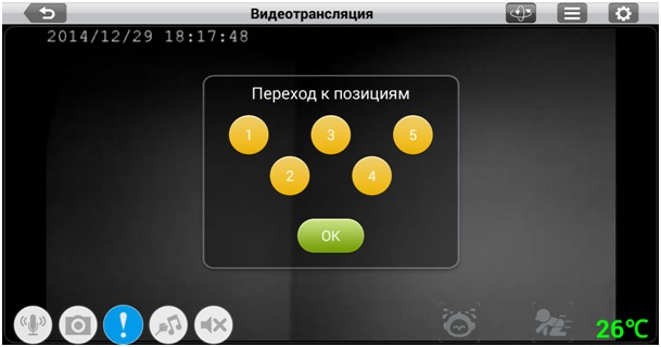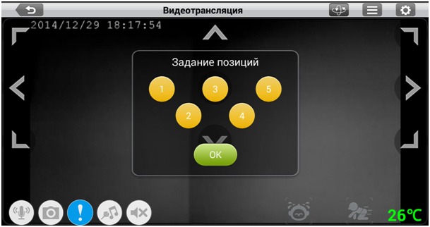Шаг 4: Кнопка Задание позиций позволяет задать до 5 любых положений камеры. С помощью джойстика (стрелок) переместите камеру в нужную позицию. Затем нажмите кнопку с номером, которая будет соответствовать выбранному положению камеры. Для подтверждения нажмите OK.